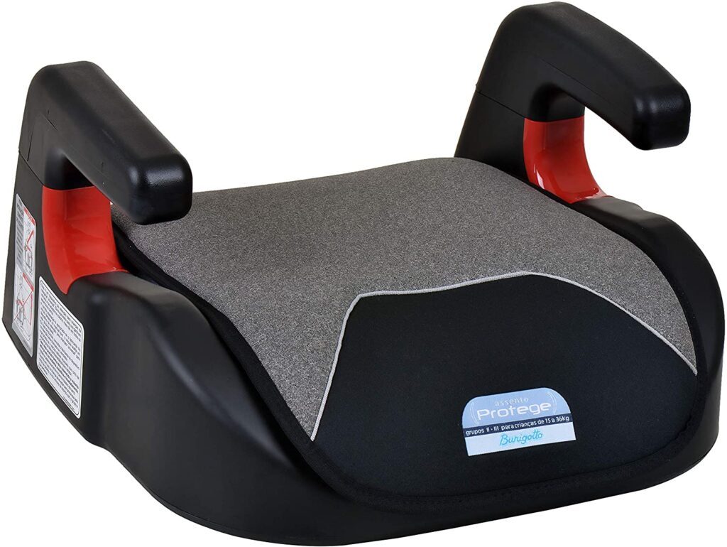 O assento de elevação Burigotto com encosto Reclinável para Auto possui estrutura leve e resistente, com encosto ajustável ao banco do carro e removível. Ele tem apoio para a cabeça regulável em três posições, com proteção contra impacto lateral, guias para passagem do cinto de segurança do carro e assento com braços laterais.