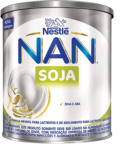A Fórmula Infantil Nestlé Nan Soy é uma importante alternativa para mães que não conseguem fornecer todo o aleitamento necessário para seus bebês. Nesta versão o produto é enriquecido com soja em sua composição. É uma fórmula infantil indicada para bebês lactentes e crianças de primeira infância, até 1 ano de idade, rica em DHA, ARA, prebióticos e nucleotídeos. Este produto contém uma lata com 800g de fórmula em pó e uma colher de medida.