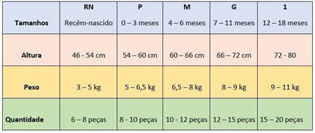 Confira a tabela abaixo, de medidas de tamanhos das roupinhas de bebê. A quantidade sugerida para compra é uma média baseada em históricos de experiências com bebês: