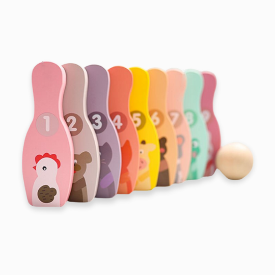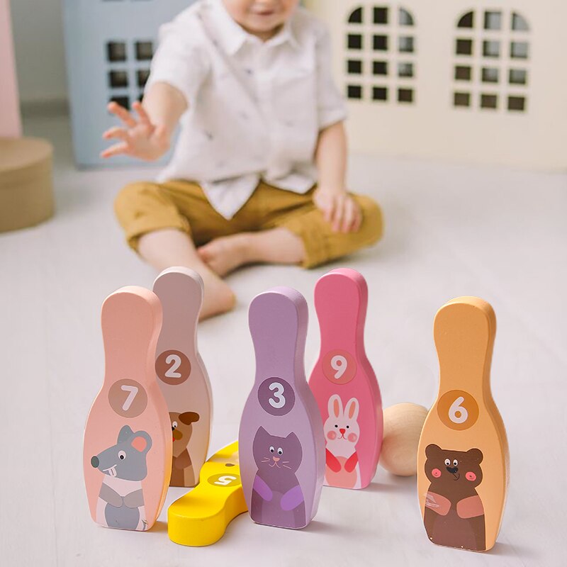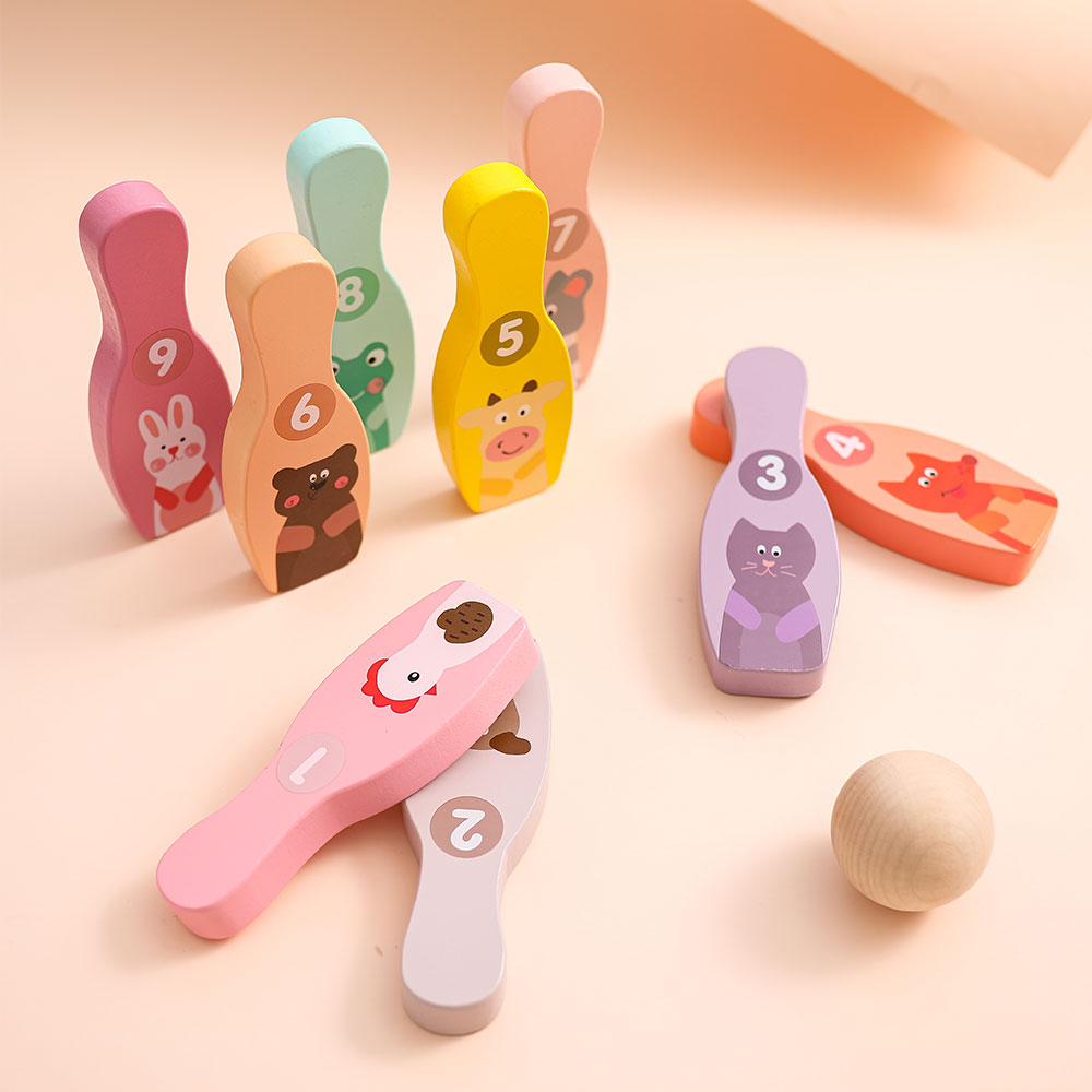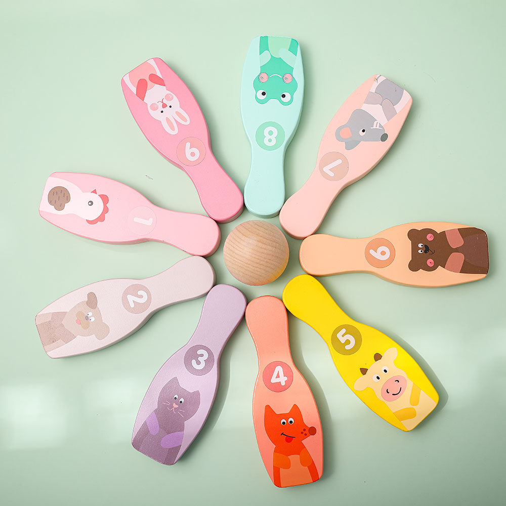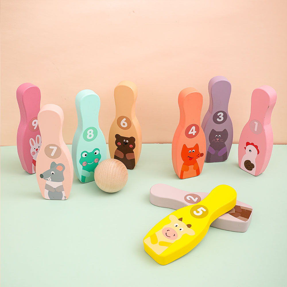 Jogo de boliche infantil Turma Animal Candy Colors em madeira para as crianças se divertirem!