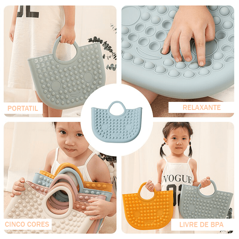 Esta bolsa combina o design dos brinquedos do momento, os Fidget Toys com a qualidade do silicone. Portátil, leve e divertida – um produto que pode ser utilizado por toda a família. Ela ajudará efetivamente a aliviar a ansiedade e o estresse, restaurando o humor além de sua função básica: transportar coisas.