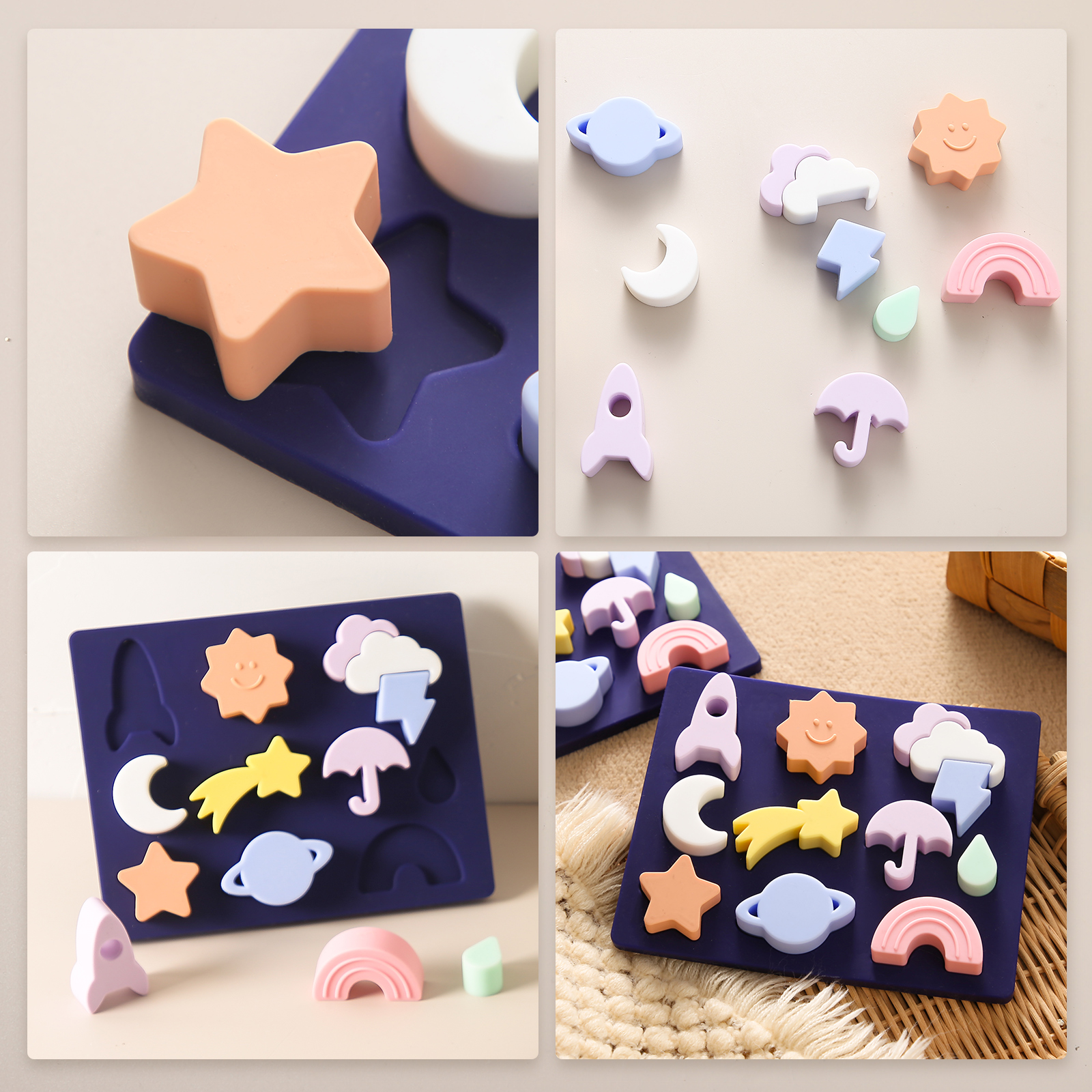 É um jogo quebra cabeça de encaixe, com peças de lindas cores, que utiliza as formas dos astros celestiais que compõem o universo para aprendizagem. Estimula o raciocínio, a coordenação motora e a memória.