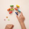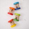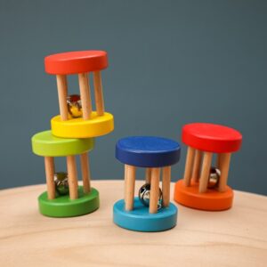 Chocalho construído em madeira maciça, nobre e de origem legal. Revestido com tinta atóxica. Brinquedo para atividade sensório-motora. Idade recomendada: a partir de 6 meses.