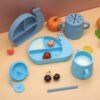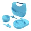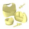 O kit inclui um babador de silicone ajustável e com bolso, um prato de silicone com divisórias e ventosa antiderrapante, uma tigela de silicone com ventosa antiderrapante e um kit de talheres (garfo e colher) com limitador de segurança.