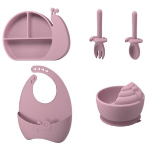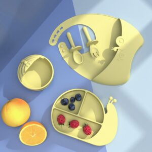 Surpreenda seu bebê na hora do papá com esse lindo Kit Alimentação de Silicone Caracol (5 peças)!
