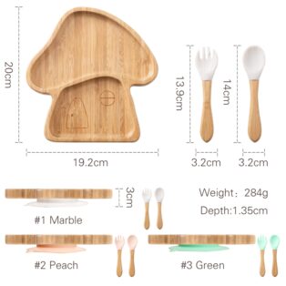 O Kit Infantil Prato de Bambu Cogumelo com Talheres (3 peças) inclui: