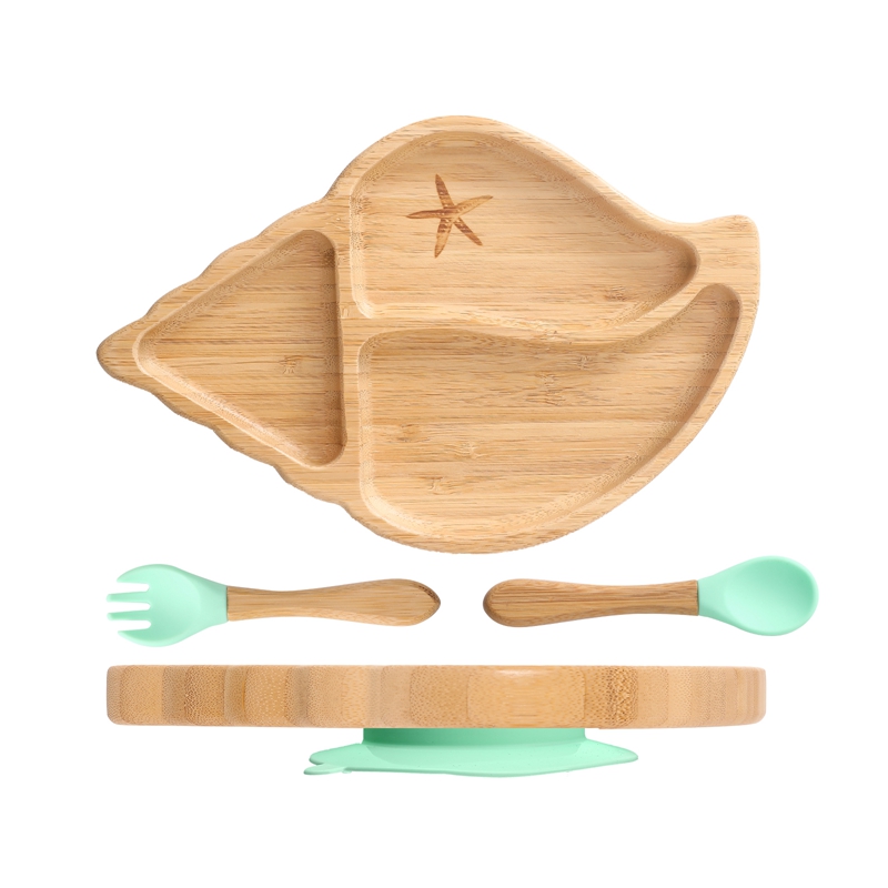 O Kit Infantil Prato de Bambu Concha e Talheres (3 peças) inclui: