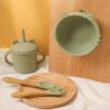 A colher e o garfo de silicone com cabo de madeira foram desenhados para ser ergonomicamente ajustáveis à mão da mamãe e do bebê. Leves de segurar, possuem suas pontas de silicone, essencial para evitar que o bebê se machuque ao usá-los. Medidas: 14cm x 3.5cm.