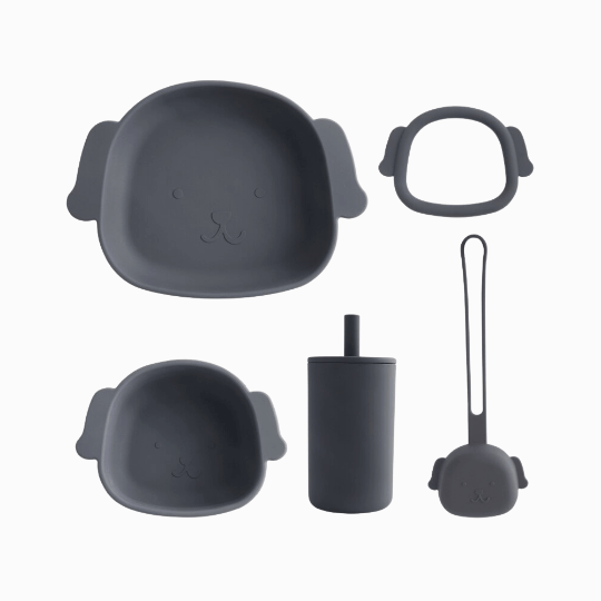 A hora da refeição é um momento super especial, e seja na hora do almoço, ou na hora do lanche, podemos ser criativas e transformar a hora do papá na hora preferida do bebê! E nada melhor do que contar com o Kit Silicone para Introdução Alimentar Doguinho (5 peças), com formato de cachorrinho, e que é composto por: prato para bebê com ventosa, tigela com ventosa, copo com canudo, mordedor de silicone e porta-chupeta de silicone.