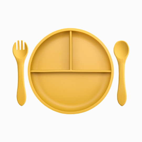 Prato de Silicone Infantil Redondo com Divisórias e Ventosa e Kit Talheres (3 peças)