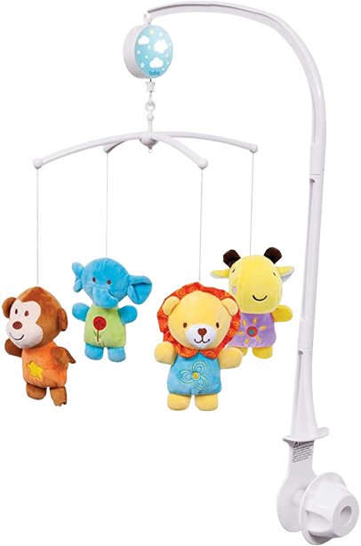 A Buba é uma das marcas que tem em seu portfólio uma maior variedade de modelos de móbiles para berço. Este, possui bichinhos que remetem a um safari, possui canções de ninar e é perfeito para auxiliar no desenvolvimento do bebê.